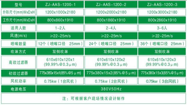 “梓凈”牌標(biāo)準(zhǔn)電加熱風(fēng)淋室技術(shù)參數(shù):