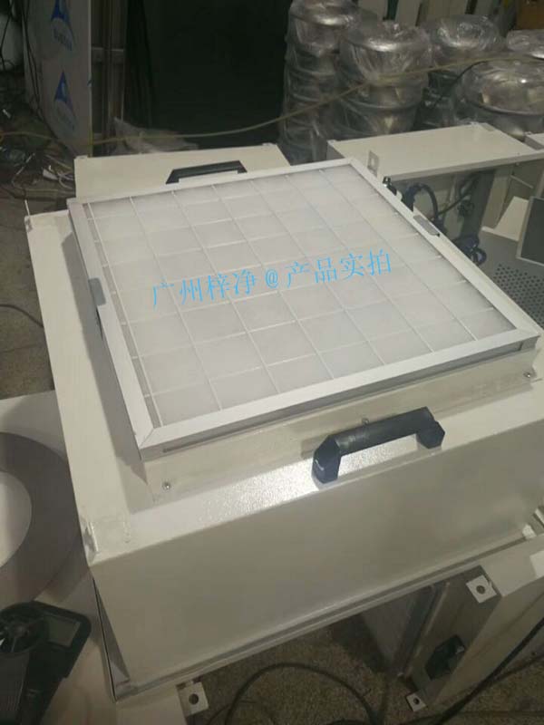 FFU層流罩設(shè)有初效過濾器、高效過濾器兩級過濾網(wǎng)。風(fēng)機(jī)從FFU頂部將空氣吸入并經(jīng)初、高效過濾器過濾,過濾后的潔凈空氣在整個出風(fēng)面以0.45M/S±20%的風(fēng)速勻速送出。