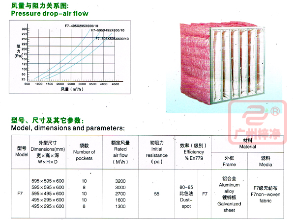 F7級(jí)袋式中效過(guò)濾器主要捕集1-5um的顆?;覊m及各種懸浮物,過(guò)濾效率80-85%@1um(EN779),過(guò)濾等級(jí)F7級(jí)。