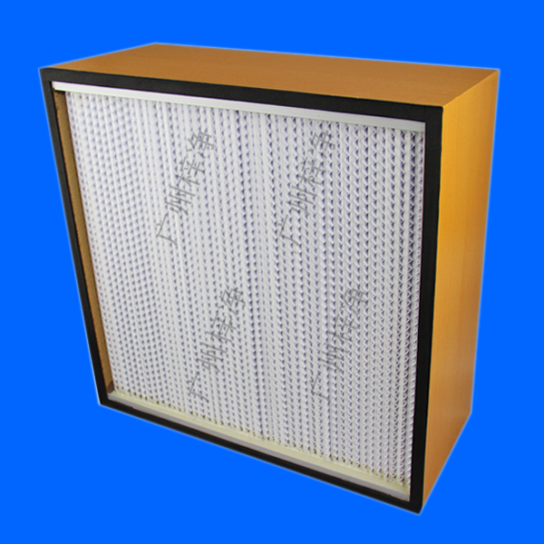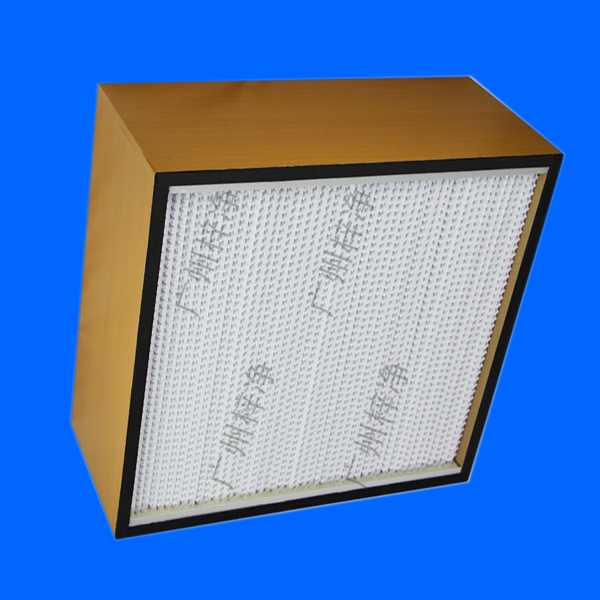 木框有隔板高效過濾器濾材兩面180褶翻折形成鍥形褶層,濾料折彎時有兩道壓痕,使其在隔板的尾端開成鍥形盒式褶層,鍥形盒式褶層可以防止濾料破損。在腐蝕性環(huán)境中,可使用鍍乙烯隔板,捕捉0.3umr粒子效率99.99%。