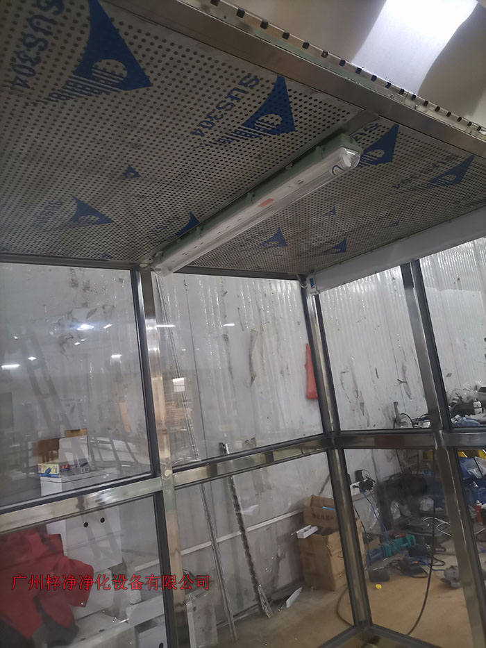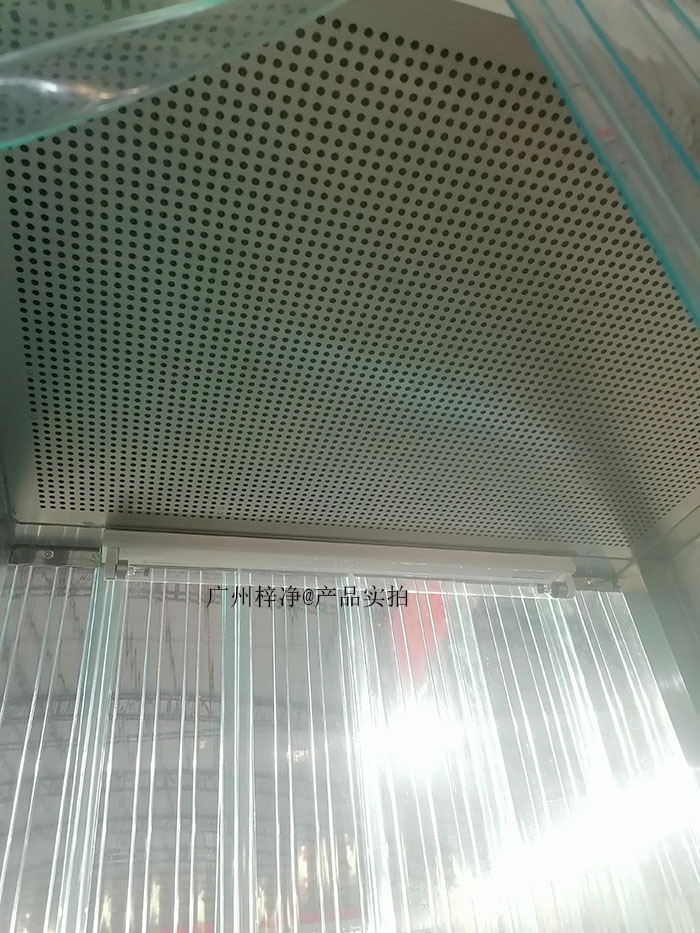 5、工作區(qū)兩側(cè)為不銹鋼擋板,前后為條形防靜電防塵垂簾,達到理想防塵效果
