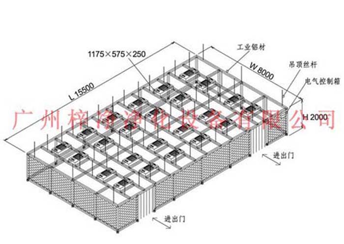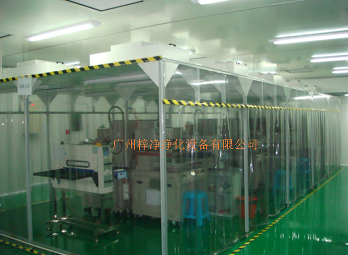 材料以鋼方通噴塑作為框架,采用風(fēng)機(jī)濾網(wǎng)機(jī)組FFU送風(fēng),凈化棚四周圍用防靜電垂簾,頂部鋪蓋密縫盲板,形成一個(gè)密縫區(qū),內(nèi)部?jī)艋?jí)別可達(dá)10—100000級(jí);特別適用于車間內(nèi)局部?jī)艋?jí)別要求高的區(qū)域,如流水線作業(yè)區(qū)域。高精確度產(chǎn)品組裝區(qū)。