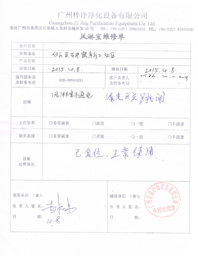 梓凈風(fēng)淋室維修單主要是我司技術(shù)人員上門維修完畢和客戶確認(rèn)的維修事項(xiàng)
